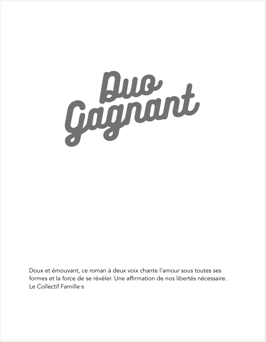 Duo Gagnant est un roman ado inclusif publié en co-branding entre le Collectif Famille·s et la maison d’édition On ne compte pas pour du beurre.