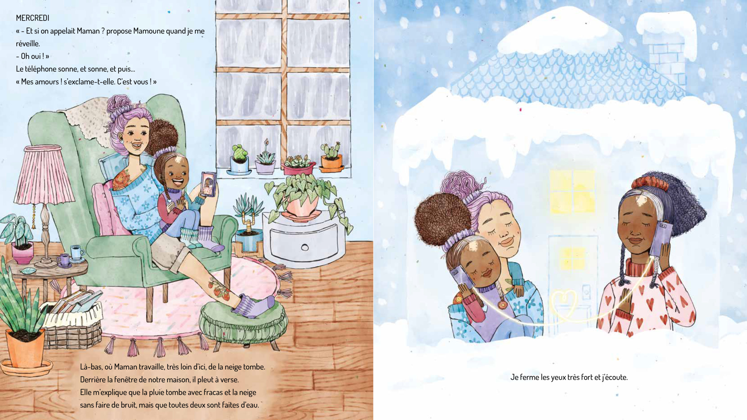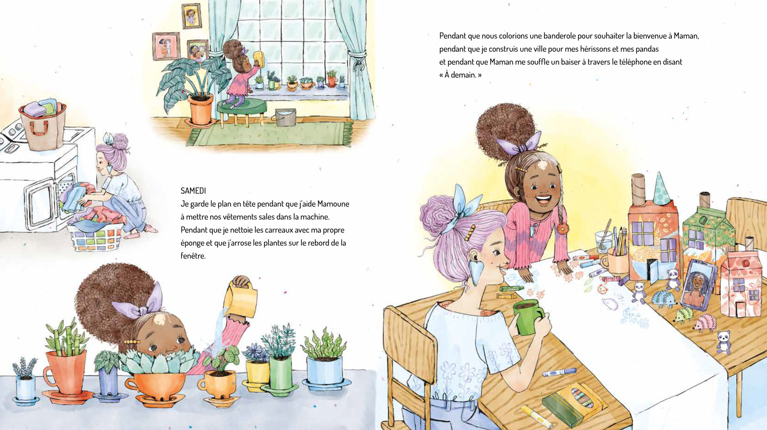 D’habitude, la fillette adore s’asseoir au milieu de ses deux mamans, son endroit préféré à table. Désormais, la place est vide, et ce vide se ressent dans son cœur. Pourtant, Mamoune fait tout pour que les jours passent plus vite et que la joie reste au rendez-vous. Ensemble, elles vont à la bibliothèque, regardent des films, font les courses et partagent des moments complices.