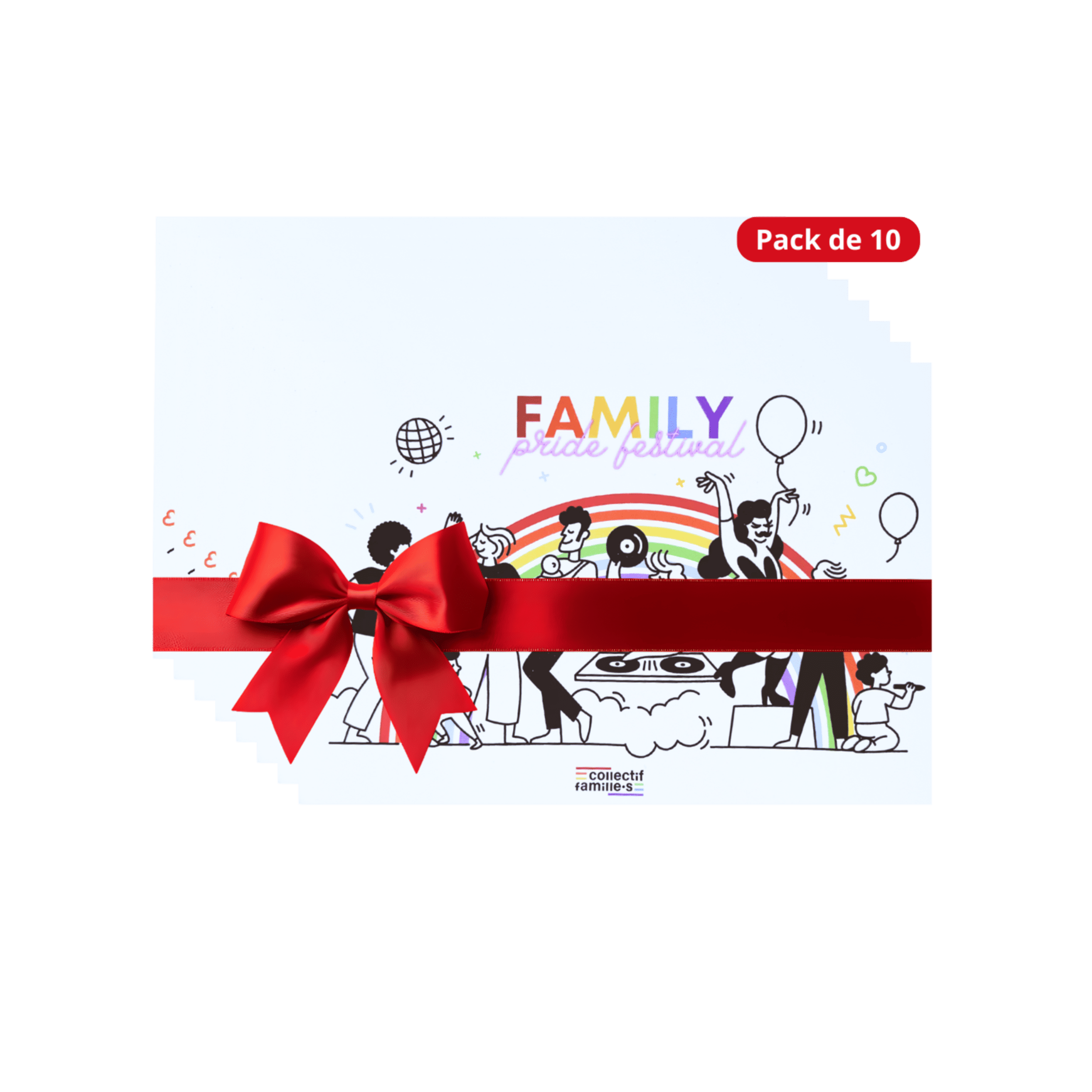 Le Family Pride Festival est un événement associatif annuel qui célèbre les familles queer et la diversité sous toutes ses formes. Avec ce pack de 10 cartes, vous pouvez prolonger l’esprit du festival bien au-delà de la journée elle-même. Chaque carte reprend l’illustration festive et inclusive du Family Pride Festival : un univers joyeux, rempli de couleurs, de danse, de rires et de symboles forts qui représentent la pluralité des familles.